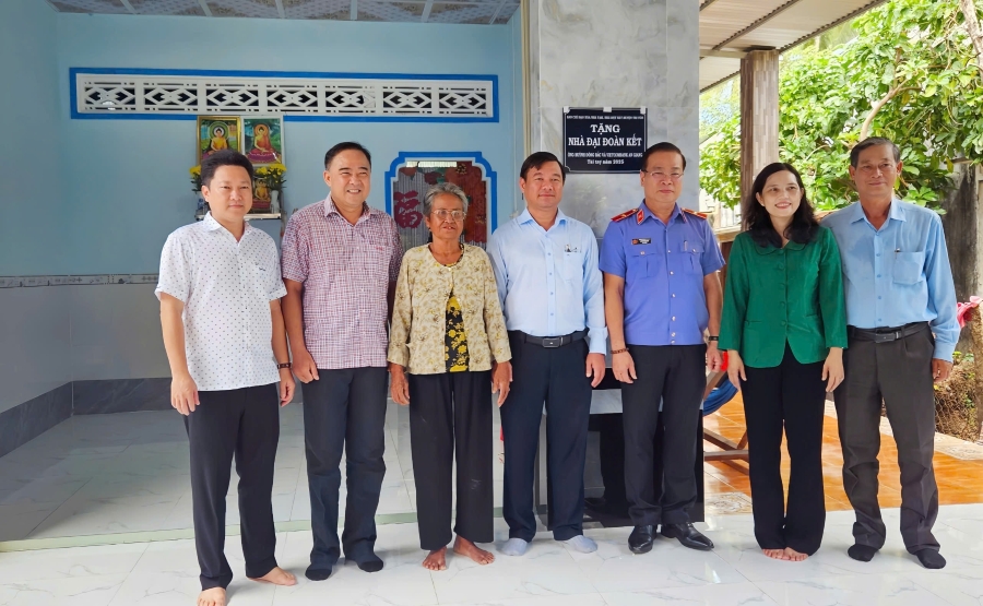 Bà Đặng Thị Hoa Rây - Ủy viên BTV Tỉnh ủy, Chủ tịch Ủy ban MTTQ Việt Nam tỉnh An Giang (thứ 8 từ trái sang), ông Huỳnh Đông Bắc - Tỉnh ủy viên, Viện trưởng Viện KSND tỉnh An Giang (thứ 6 từ trái sang), ông Lâm Thành Sĩ - Tỉnh ủy viên, Bí thư huyện ủy Tri Tôn (thứ 5 từ trái sang), ông Trần Lý Phước Thọ - Giám đốc Vietcombank An Giang (thứ 9 từ trái sang) cùng chụp ảnh lưu niệm tại buổi lễ