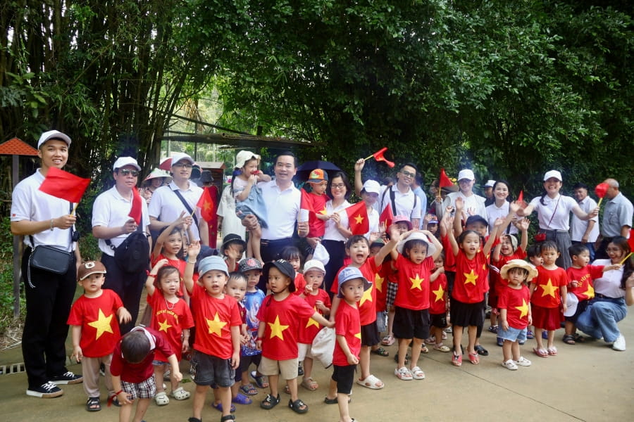 Đại biểu Chi bộ 10 chụp ảnh lưu niệm cùng các cháu thiếu nhi địa phương tại quần thể Khu di tích lịch sử Kim Liên