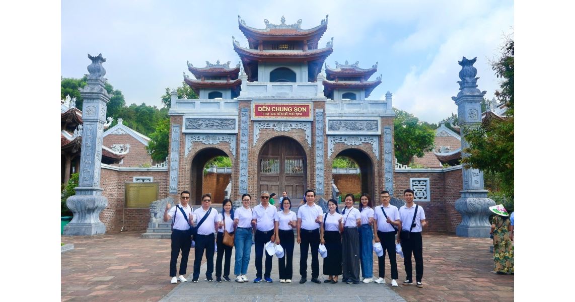 Đoàn đại biểu Chi bộ 10 chụp ảnh lưu niệm sau khi dâng hương tại Đền Chung Sơn - Đền thờ gia tiên Chủ tịch Hồ Chí Minh