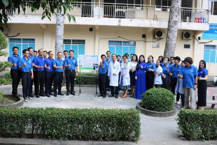 Các cơ sở đoàn cùng chụp hình lưu niệm tại Khu tập vật lý trị liệu ngoài trời phục vụ người bệnh, Bệnh viên đa khoa tỉnh Bình Dương