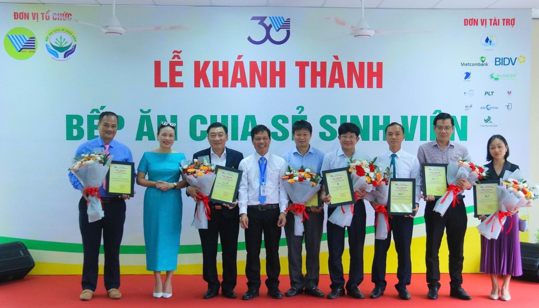 Ông Trần Trung Tường - Phó Giám đốc Vietcombank Tân Sơn Nhất (thứ ba từ trái qua) nhận hoa và thư cảm ơn từ đại diện Trung tâm quản lý ký túc xá và khu đô thị Đại học quốc gia TP.HCM