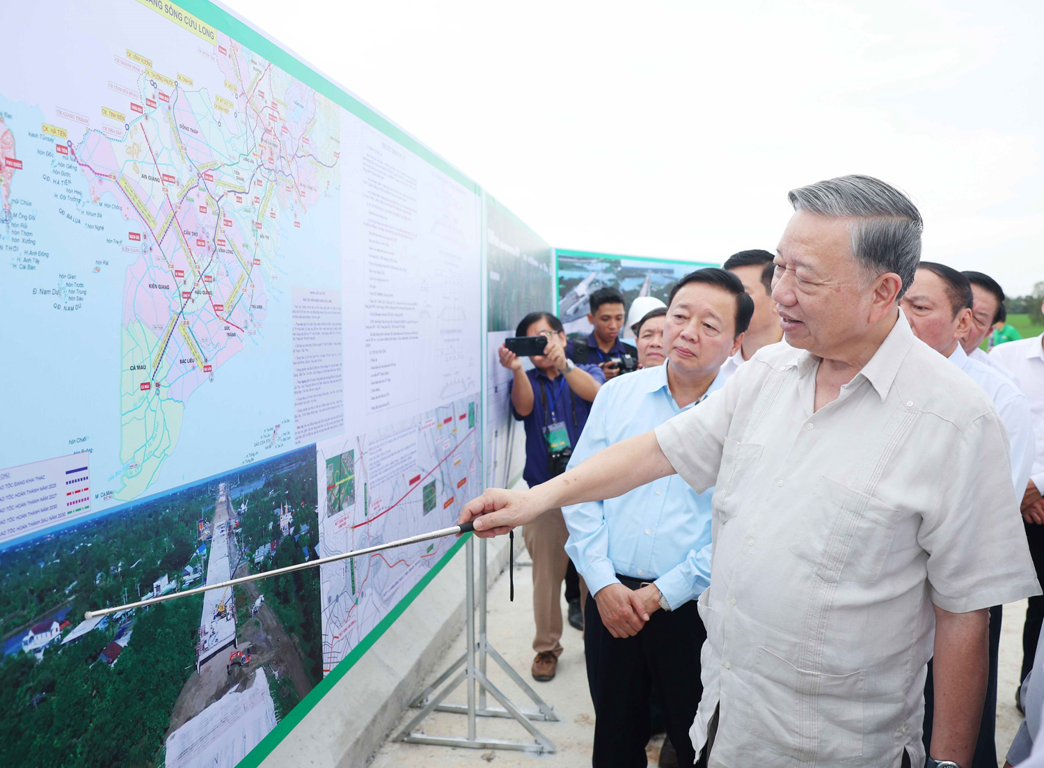 Tổng Bí thư Tô Lâm khảo sát Dự án cao tốc Cao Lãnh - An Hữu, đoạn xã Mỹ Thọ, huyện Cao Lãnh (kết nối tỉnh Đồng Tháp với tỉnh Tiền Giang) _Ảnh: TTXVN