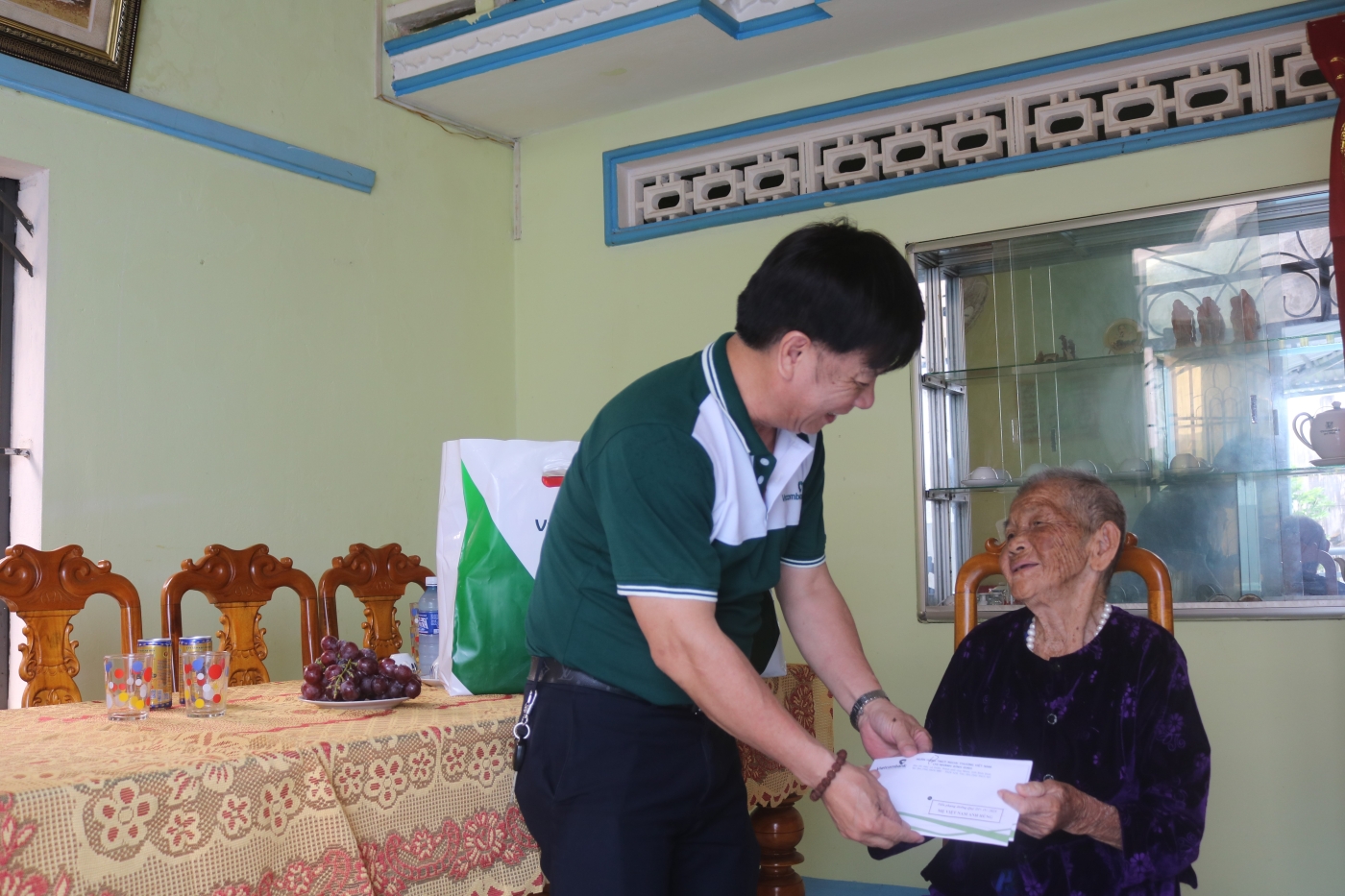 Ông Nguyễn Tấn Chúc - Phó Chủ tịch thường trực CĐCS Vietcombank Bình Định thăm và tặng quà Mẹ Việt Nam anh hùng Thái Thị Hương