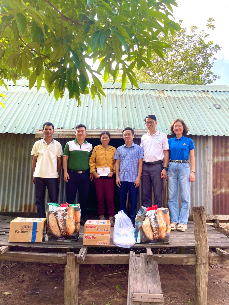 Ông Bùi Chu Giang - Bí thư Đoàn cơ sở (thứ 2 từ trái sang), bà Đinh Thị Mỹ Hạnh - Phó Bí thư Đoàn cơ sở (ngoài cùng bên phải) cùng đại diện Hội chữ thập đỏ và chính quyền địa phương trao quà cho bà con có hoàn cảnh khó khăn trên địa bàn xã Kon Chiêng, tỉnh Gia Lai