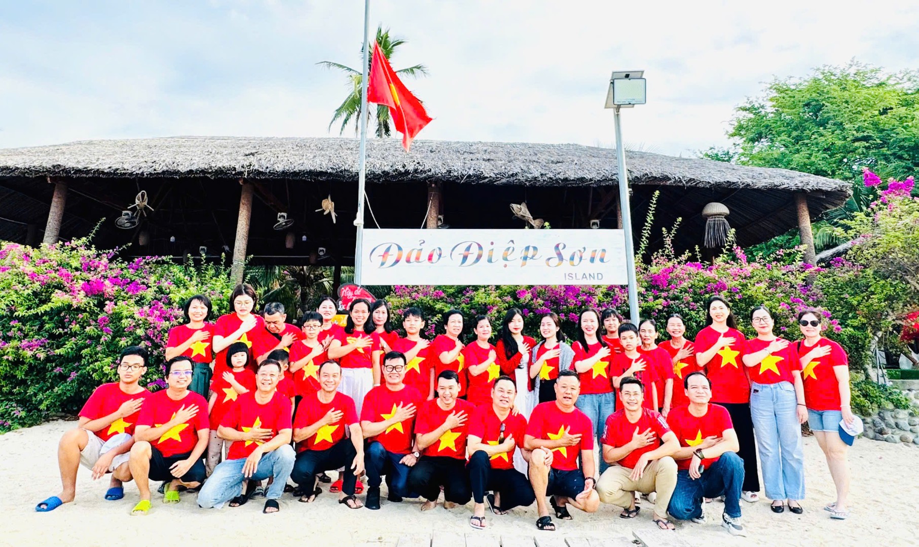 Điệp Sơn, với con đường đi bộ giữa biển độc đáo, đã trở thành điểm đến lý tưởng cho chuyến du lịch của chi nhánh Nam Bình Dương. Anh Huỳnh Công Nam chia sẻ, ý tưởng mang theo áo cờ đỏ sao vàng xuất phát từ mong muốn hòa mình vào chương trình “Cùng Việt Nam tiến bước”. Trùng hợp với thời điểm diễn ra chương trình, Phòng Hành chính Nhân sự đã quyết định kết hợp chuyến đi để tổ chức lễ chào cờ trang nghiêm ngay trên đảo. “Mỗi bước chân trên hành trình khám phá đất nước không chỉ là hành trình cá nhân, mà còn là hành trình của trái tim hướng về Tổ quốc,” anh Nam nhấn mạnh. Chiếc áo cờ đỏ sao vàng không chỉ là biểu tượng của niềm tự hào dân tộc mà còn là lời cam kết của tập thể Vietcombank Nam Bình Dương trong việc góp phần vào sự phát triển của đất nước.