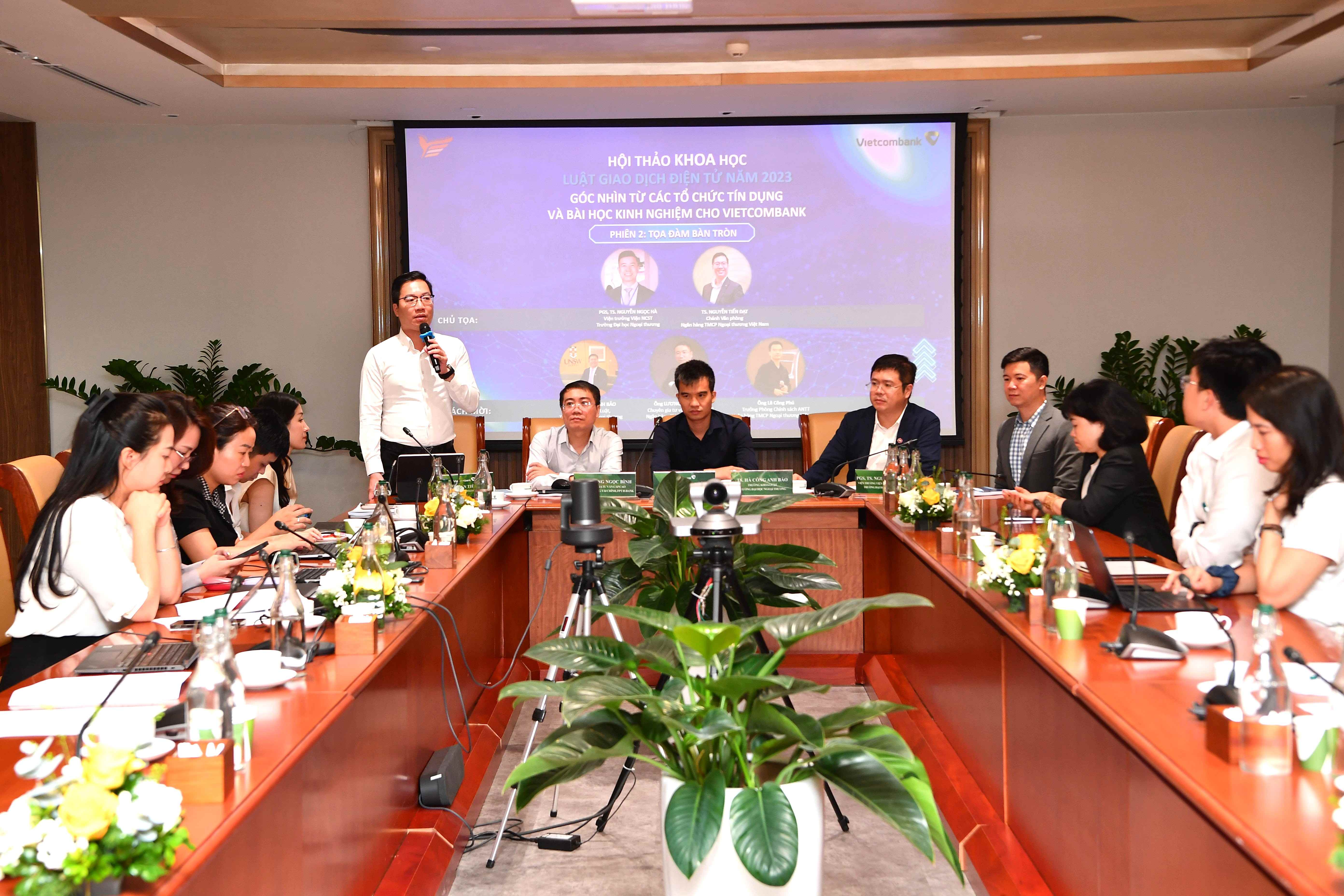 Tại phiên 2: Tọa đàm bàn tròn với chủ đề “Vietcombank và những triển vọng từ Luật Giao dịch điện tử năm 2023” do TS. Nguyễn Tiến Đạt - Chánh Văn phòng Vietcombank và PGS. TS. Nguyễn Ngọc Hà - Viện trưởng Viện Nghiên cứu sáng tạo đồng chủ trì. Tại phiên này, các khách mời và các đại biểu đã trao đổi rất nhiều nội dung hữu ích xoay quanh Luật Giao dịch điện tử năm 2023.