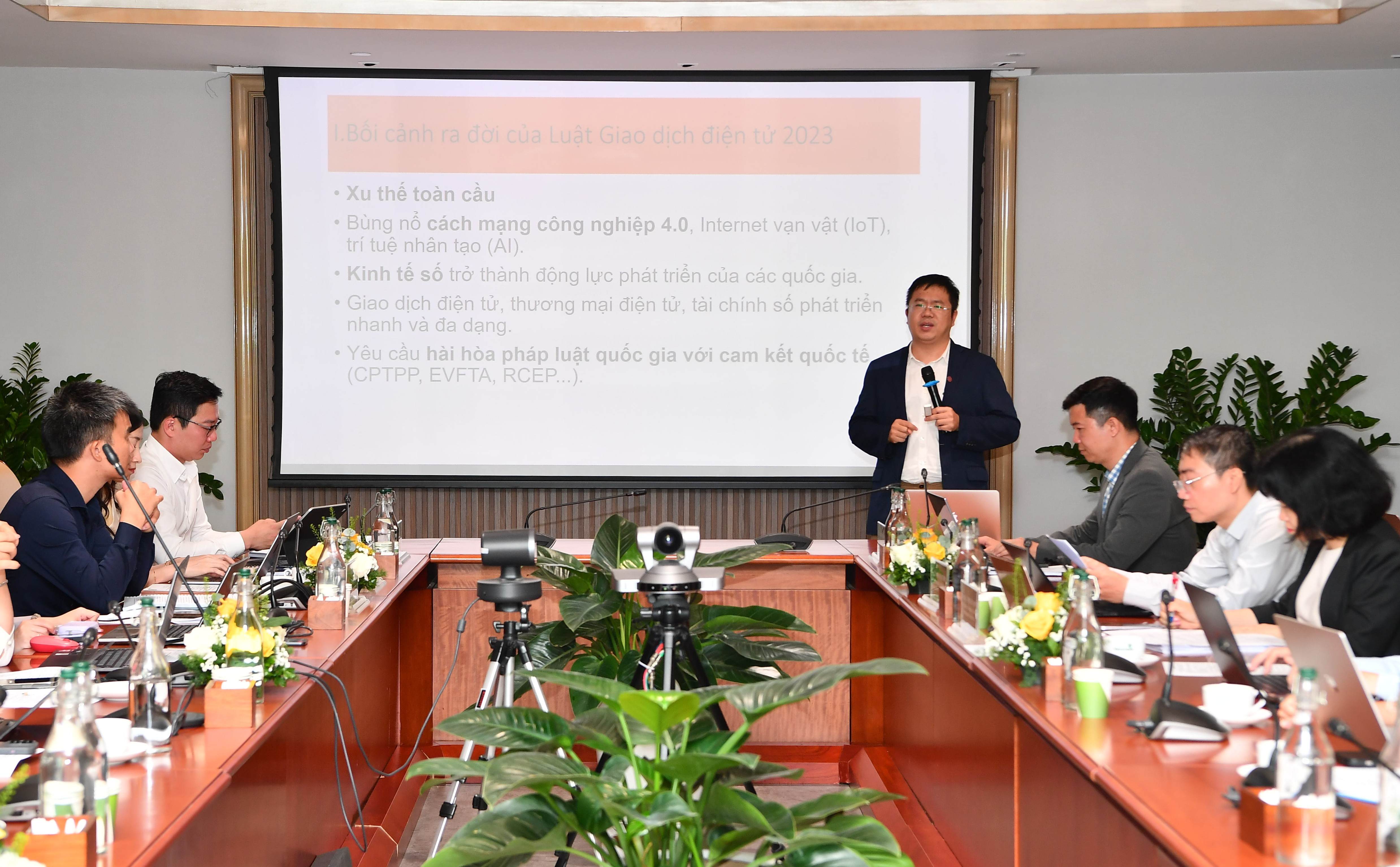 Phát biểu khai mạc Hội thảo, TS. Nguyễn Tiến Đạt - Chánh Văn phòng Vietcombank cho biết: Luật Giao dịch điện tử năm 2023, thay thế Luật Giao dịch điện tử năm 2005, chính thức có hiệu lực từ ngày 01/07/2024, chứa đựng nhiều điểm mới với mục đích tạo điều kiện thuận lợi cho việc thực hiện và phòng tránh hiệu quả các rủi ro của giao dịch điện tử (quy định về chữ ký điện tử, chữ ký số, hợp đồng điện tử, chứng thư điện tử, dịch vụ tin cậy…). Là chủ thể kinh doanh sớm triển khai thực hiện giao dịch điện tử, Vietcombank đã tích cực triển khai thực hiện Luật Giao dịch điện tử năm 2023. Tuy nhiên, những quy định mới cùng với sự phát triển không ngừng của những tiến bộ công nghệ gần đây đã đặt ra không ít thách thức trong việc thực hiện hiệu quả Luật. Do đó, để có thể đánh giá một cách toàn diện thực trạng triển khai áp dụng Luật Giao dịch điện tử năm 2023 tại các TCTD nói chung và tại Vietcombank, từ đó, chỉ ra được những rủi ro, thách thức và đưa ra những giải pháp hữu ích nâng cao hiệu quả thực thi Luật, Văn phòng Vietcombank và Viện Nghiên cứu sáng tạo (Trường Đại học Ngoại thương) đã đồng phối hợp tổ chức Hội thảo. Đây sẽ là cơ hội để các nhà quản lý của Vietcombank có thể trao đổi cùng các chuyên gia, nhà khoa học, người hoạt động thực tiễn trong lĩnh vực tài chính ngân hàng về những kinh nghiệm triển khai Luật Giao dịch điện tử năm 2023.