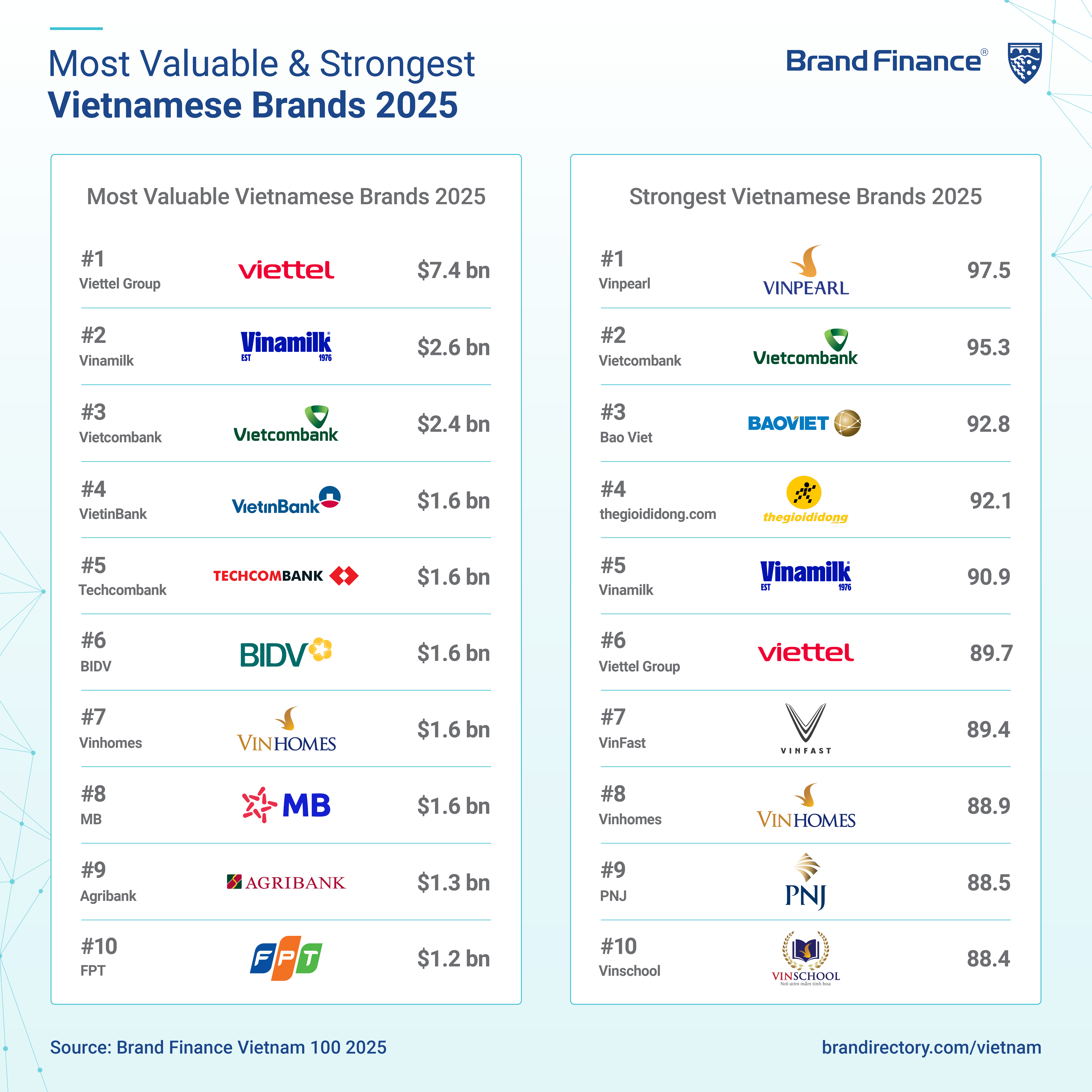 Theo Báo cáo Vietnam 100 năm 2025 do Brand Finance - tổ chức định giá thương hiệu hàng đầu thế giới vừa công bố, Vietcombank tiếp tục giữ vững vị thế ngân hàng có giá trị thương hiệu lớn nhất Việt Nam, ghi nhận ba năm liên tiếp giữ vững vị thế này, đồng thời nằm trong Top 2 thương hiệu mạnh nhất cả nước.