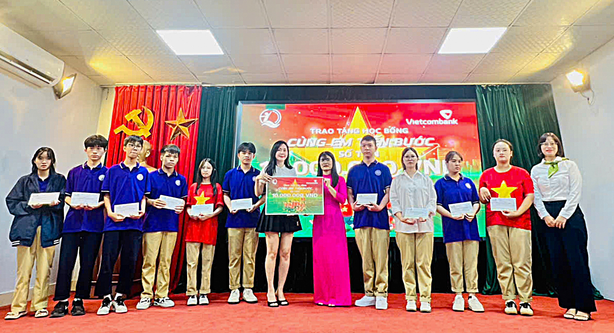 Đại diện Vietcombank Hà Thành (đứng giữa) trao tặng học bổng “Cùng em tiến bước” cho các em học sinh Trường THPT Mai Hắc Đế