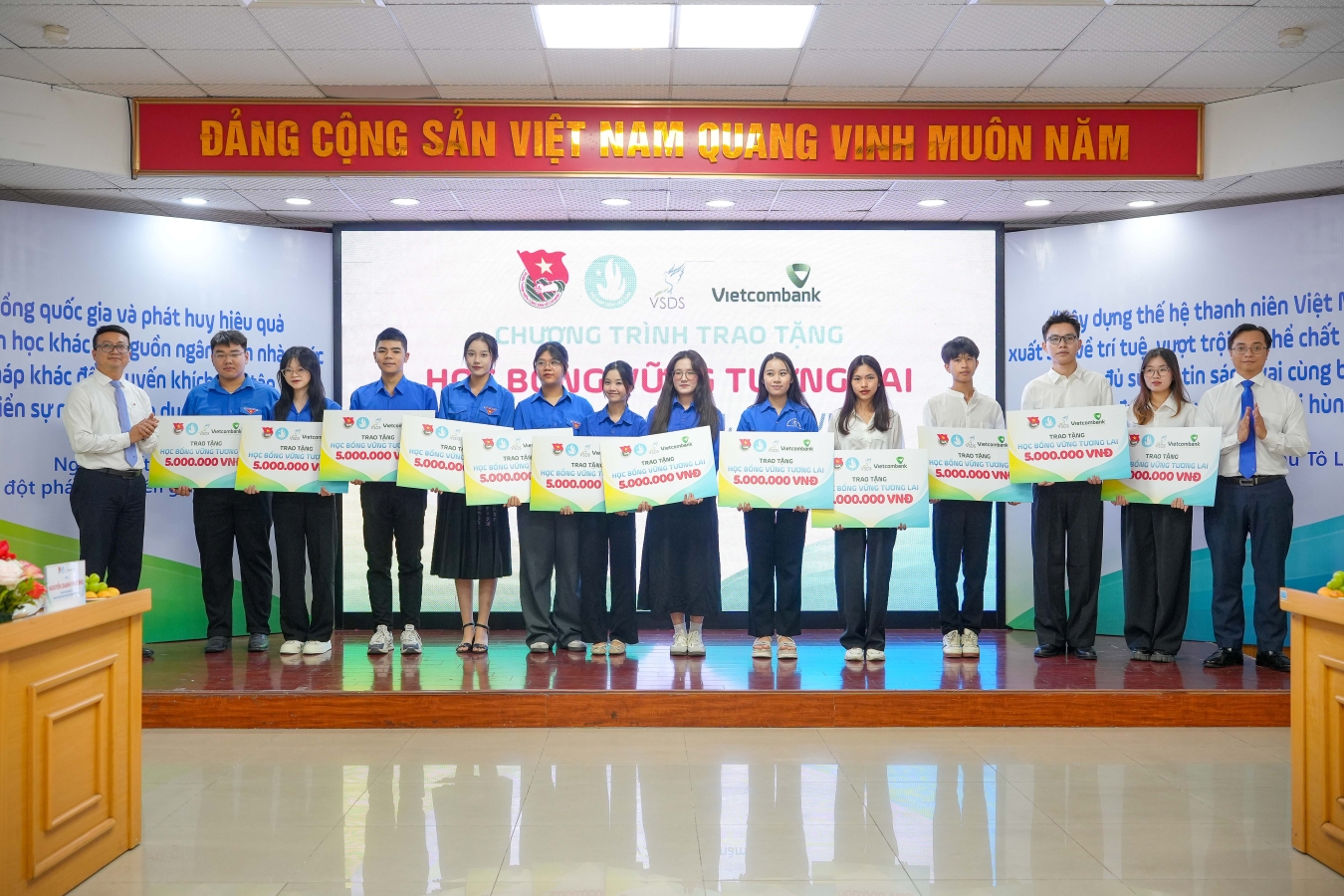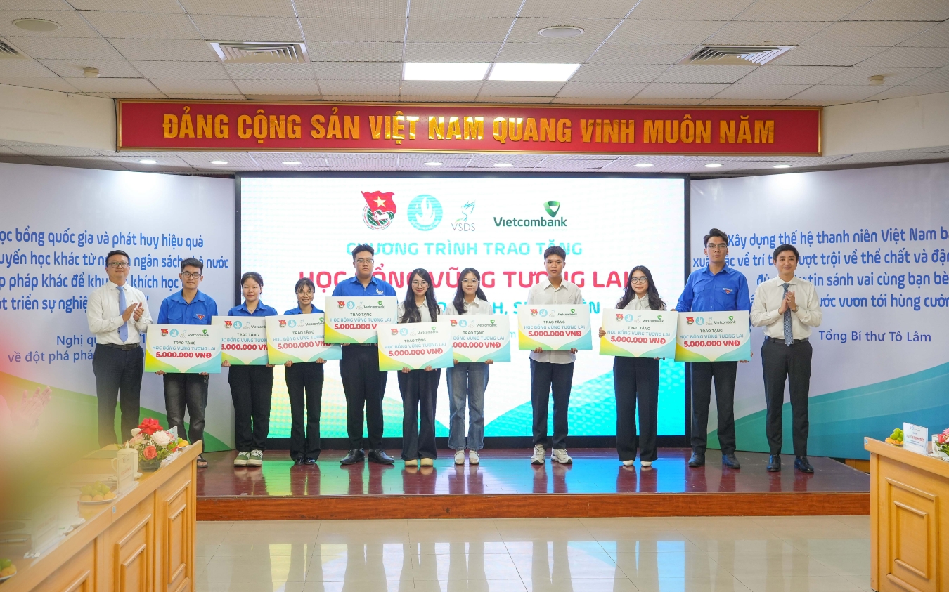 Đ/c Dương Bảo Trung - Bí thư Đoàn Thanh niên Vietcombank (ngoài cùng, bên trái) và đ/c Nguyễn Đức Nguyên - Phó Trưởng Ban công tác Thanh thiếu nhi Trung ương Đoàn, Phó Chủ tịch Trung ương Hội Sinh viên Việt Nam (ngoài cùng, bên phải) trao các học bổng loại B của Quỹ Vững tương lai cho các bạn học sinh, sinh viên tiêu biểu