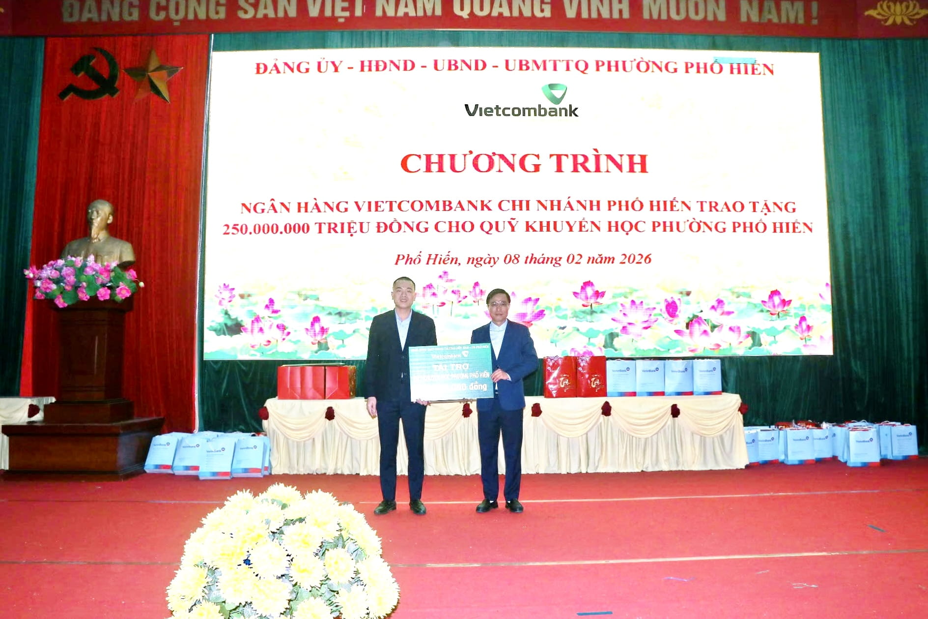 Đ/c Hồng Quang - Thành viên HĐQT, Chủ tịch Công đoàn Vietcombank (ngoài cùng bên trái) và đ/c Nguyễn Danh Phương - Phó Bí thư Đảng ủy Vietcombank (ngoài cùng,bên phải) trao biển biểu trưng các suất quà hỗ trợ cho các hộ nghèo, gia đình chính sách tại tỉnh Tây Ninh