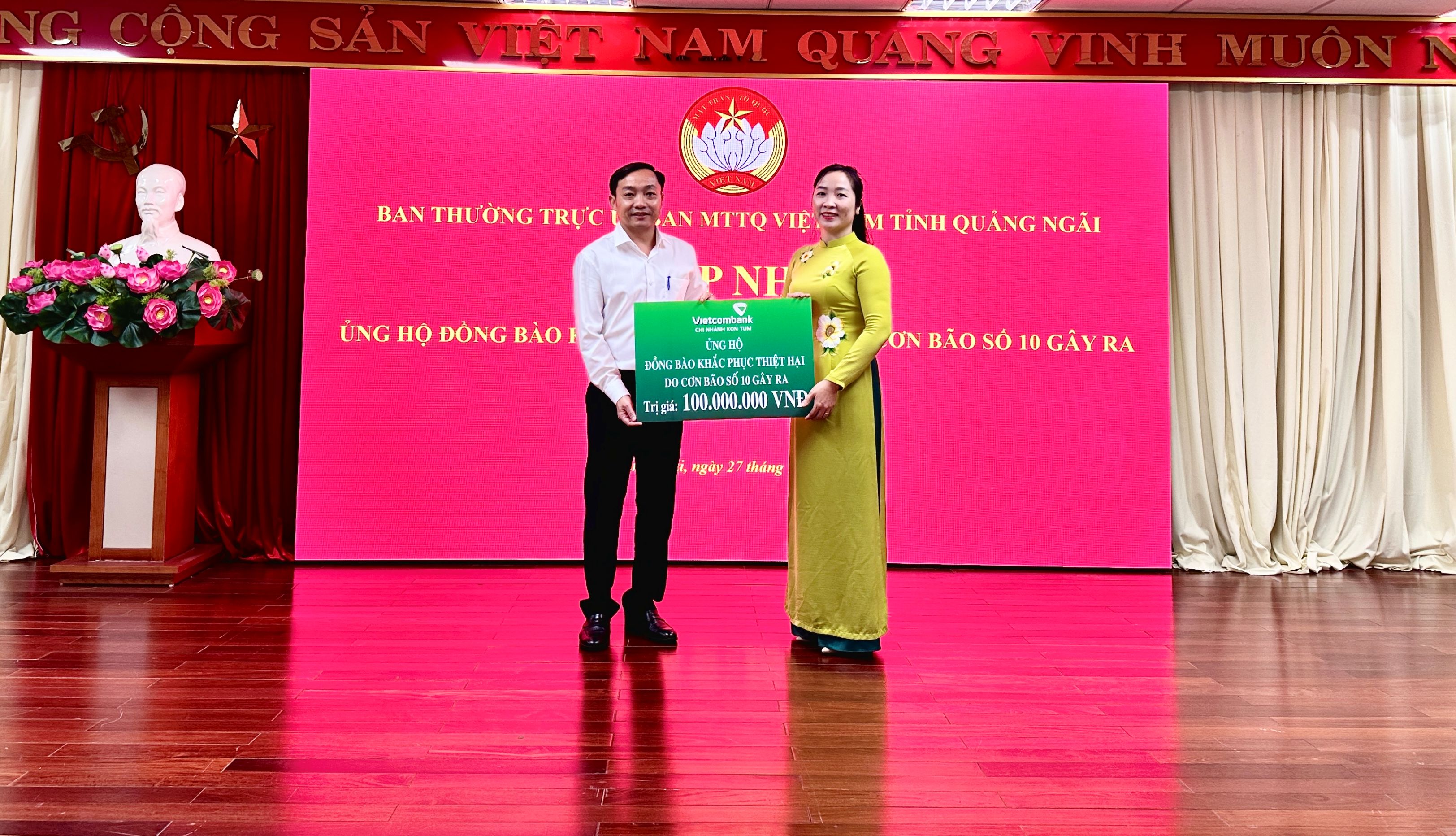 Tại buổi lễ, Vietcombank Kon Tum trao tặng số tiền ủng hộ 100 triệu đồng thông qua Ủy ban MTTQ Việt Nam tỉnh Quảng Ngãi. Việc hỗ trợ đồng bào vùng thiên tai là hành động thiết thực, thể hiện tinh thần tương thân tương ái và cam kết đồng hành cùng cộng đồng của Vietcombank Kon Tum.