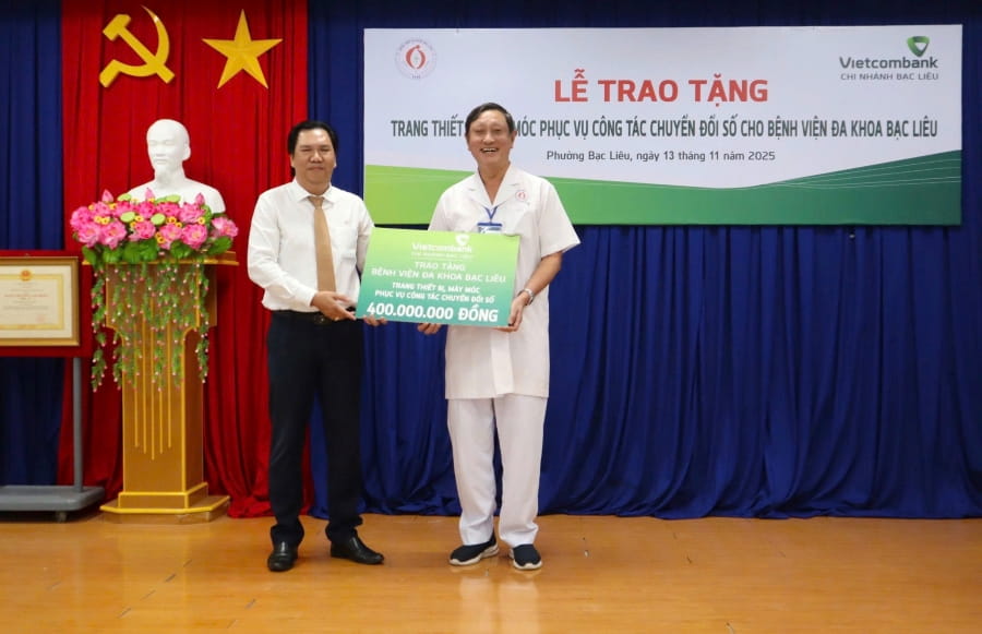 Chiều ngày 13/11/2025, Chi nhánh Vietcombank Bạc Liêu đại diện cho Vietcombank đã tổ chức Lễ trao tặng trang thiết bị và dụng cụ y tế phục vụ công tác chuyển đổi số cho Bệnh viện Đa khoa Bạc Liêu với tổng giá trị 400 triệu đồng.