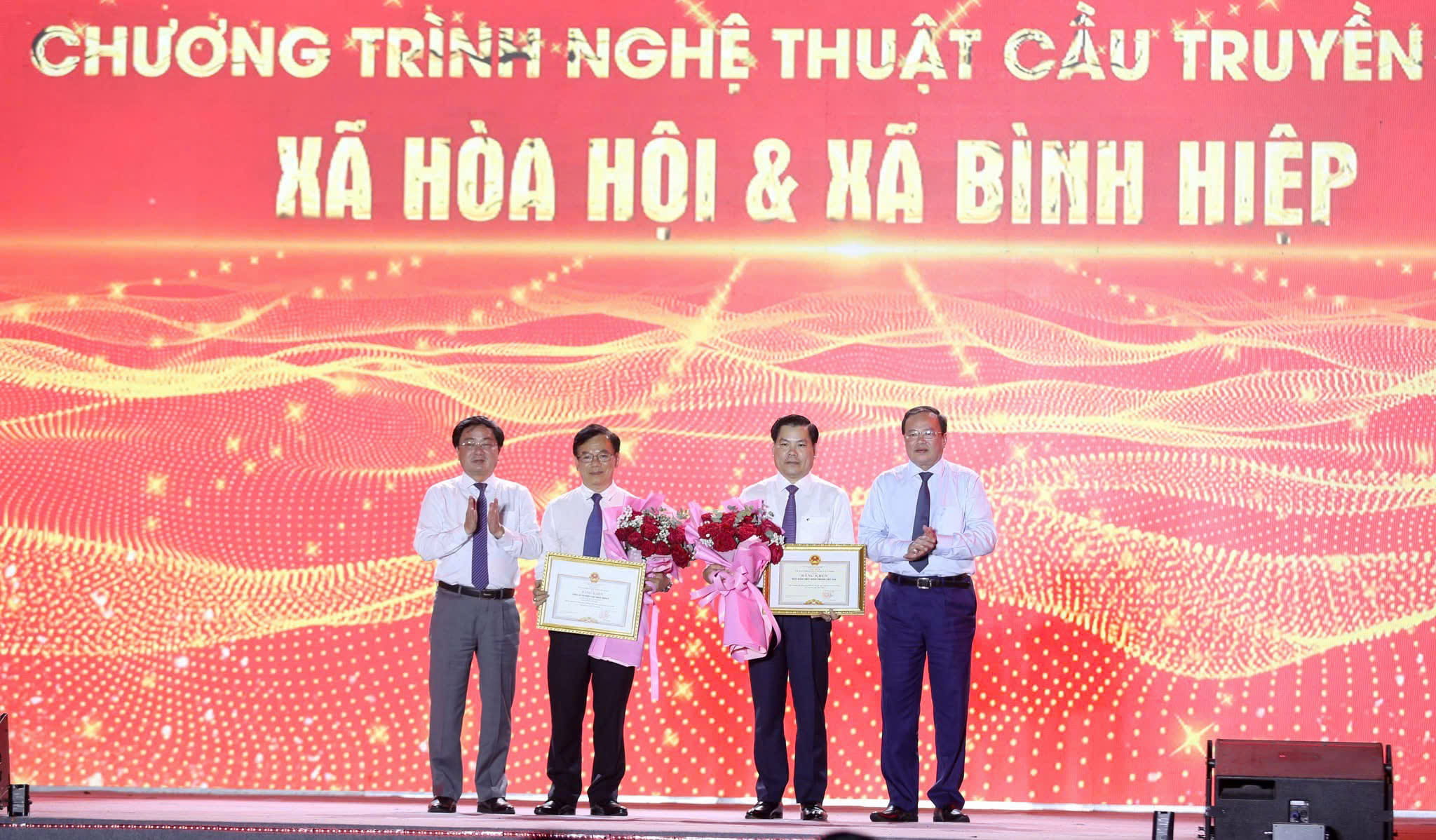 Đại diện Vietcombank, đ/c Đặng Hoài Đức, Phó Tổng giám đốc (thứ 2 từ trái sang) và đ/c Nguyễn Văn Lập, Giám đốc Chi nhánh Vietcombank TP.HCM (thứ 2 từ phải sang) nhận bằng khen của UBND tỉnh Tây Ninh đối với những đóng góp của Vietcombank cho công tác ASXH tại địa phương