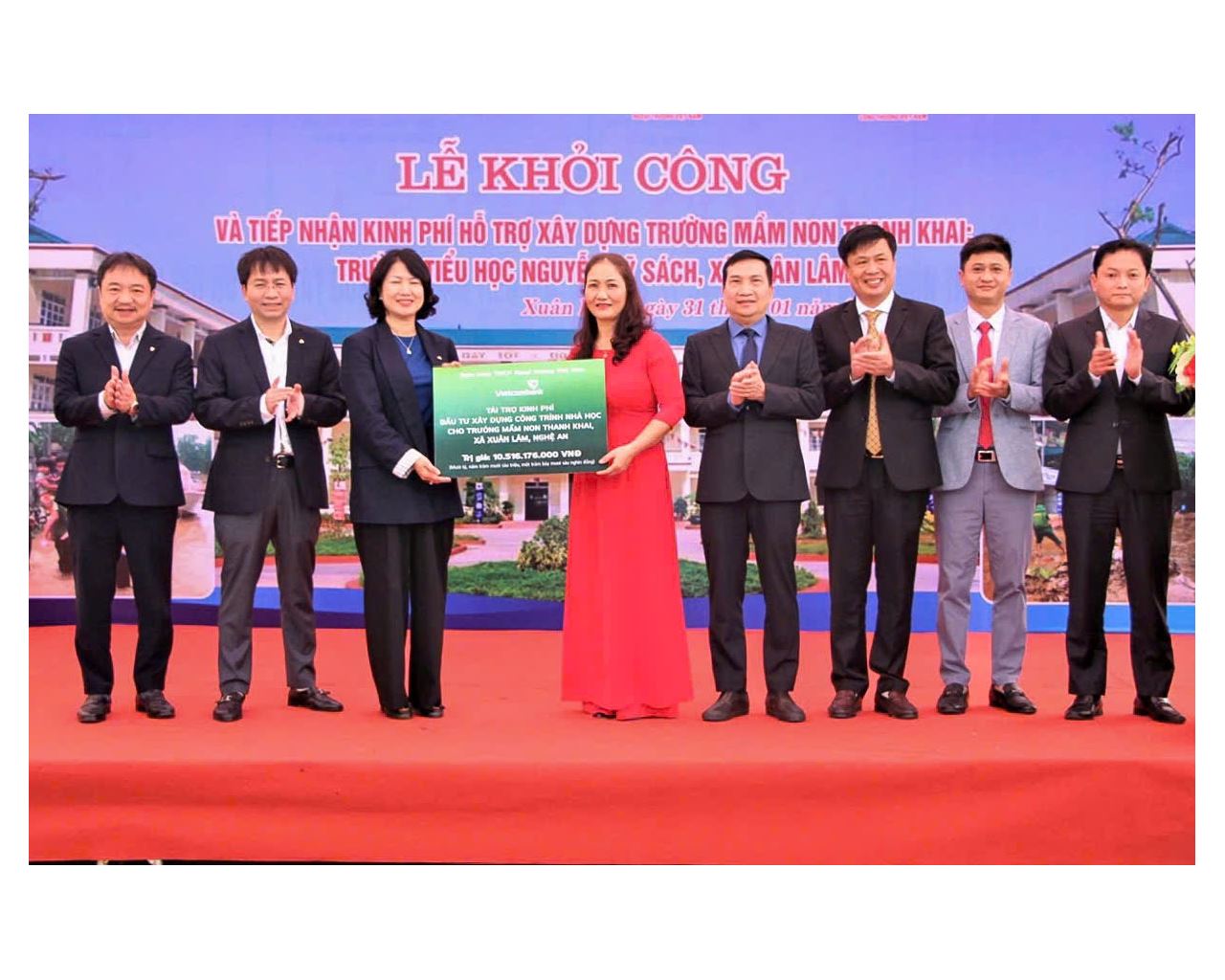 Thay mặt Ban lãnh đạo Vietcombank, đồng chí Nguyễn Thị Hồng Vân - Giám đốc khối Pháp chế và Tuân thủ (thứ 3 từ trái sang) trao số tiền tài trợ hơn 10,5 tỷ đồng hỗ trợ kinh phí xây dựng công trình Nhà đa chức năng tại Trường Tiểu học Nguyễn Sỹ Sách và dãy nhà học 2 tầng tại Trường mầm non Thanh Khai tại tỉnh Nghệ An