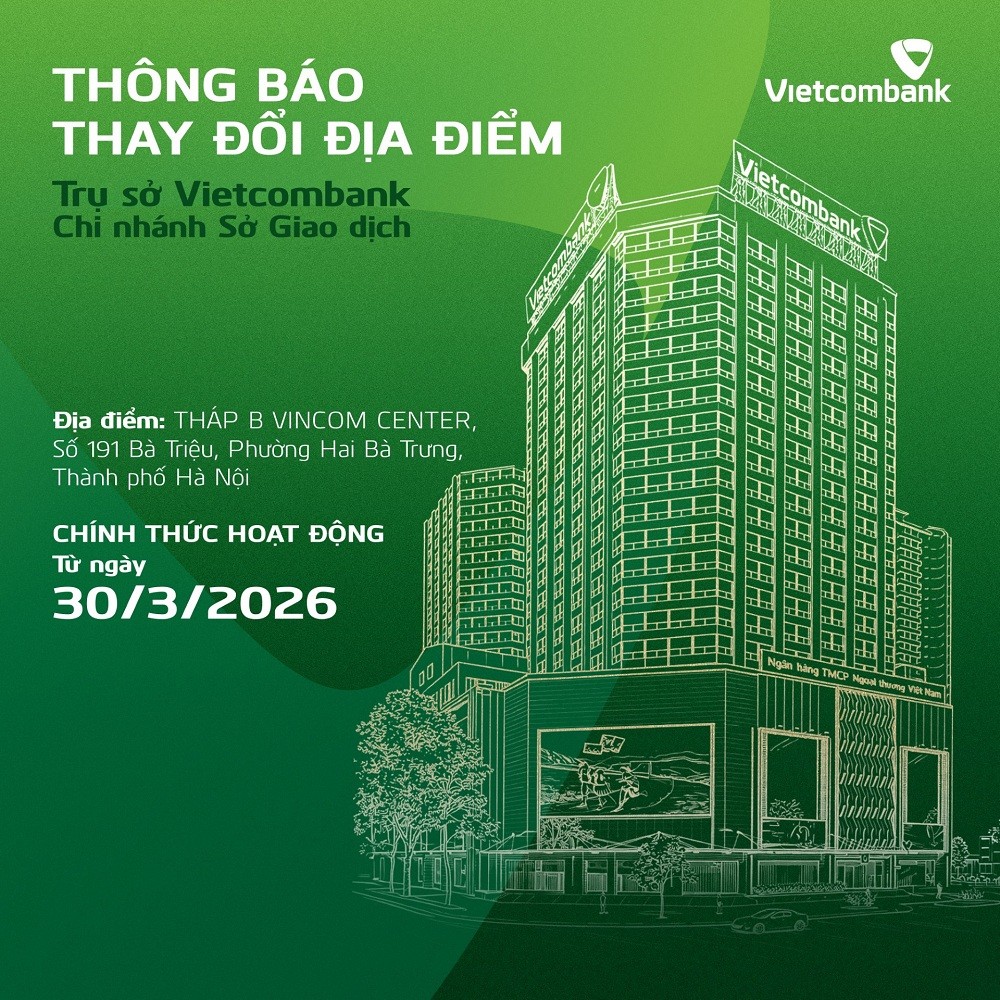 Ngân hàng TMCP Ngoại thương Việt Nam - Chi nhánh Sở giao dịch (Vietcombank Sở giao dịch) trân trọng thông báo, kể từ ngày 30/3/2026, chi nhánh Vietcombank  Sở giao dịch thay đổi địa điểm hoạt động.