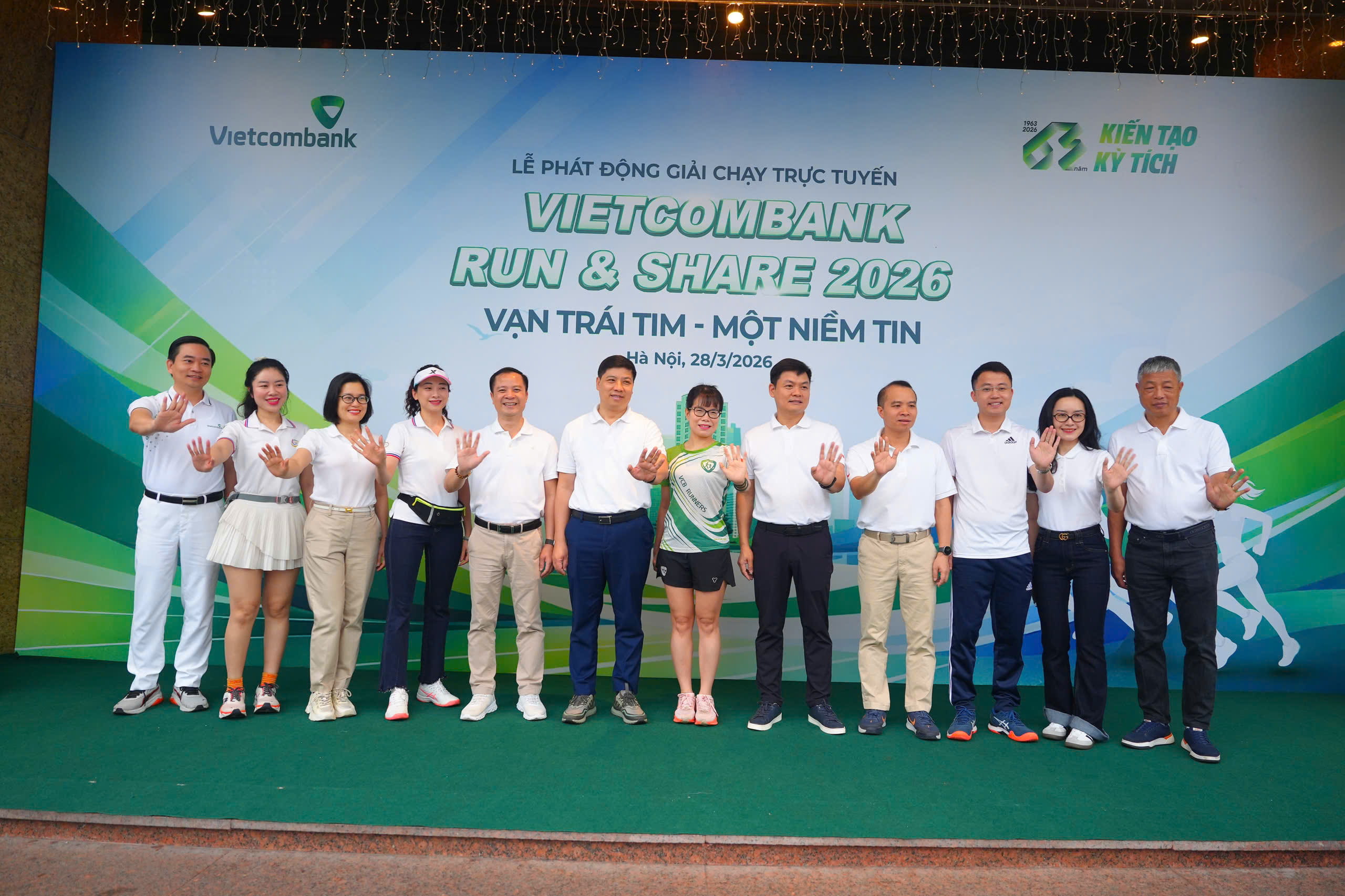 Khoảnh khắc lãnh đạo Vietcombank cùng các đại biểu, khách mời và cán bộ, người lao động đồng loạt giơ cao tay khởi động “Vietcombank Run & Share 2026” – nơi mỗi bước chạy bắt đầu một hành trình sẻ chia