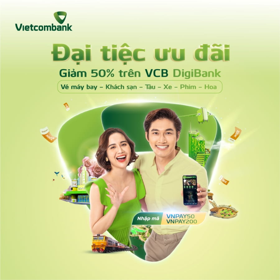 - Giảm 50% tối đa 50.000 đồng khi nhập mã ưu đãi VNPAY50, dành cho các khách hàng thực hiện giao dịch đặt vé tàu, xe, vé xem phim, đặt hoa trên ứng dụng VCB Digibank. Khuyến mại áp dụng cho 4000 khách hàng đầu tiên mỗi ngày.