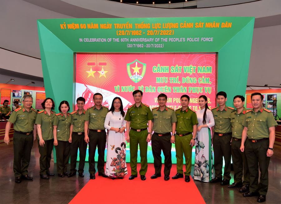 Trung tướng Nguyễn Duy Ngọc - Thứ trưởng Bộ Công an (thứ 7 từ trái sang) chụp ảnh kỷ niệm cùng các đại biểu tại triển lãm