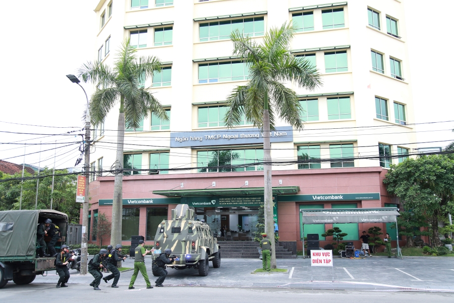 Buổi diễn tập đã tổ chức tình huống giả định có các nghi phạm cầm vũ khí đe dọa nhân viên trong quầy nhằm cướp tiền tại quầy. Bộ phận nhân viên giao dịch bình tĩnh nghe theo yêu cầu của đối tượng để đảm bảo an toàn, cố gắng kéo dài thời gian và tìm cách ấn báo động cho công an. Bộ phận bảo vệ tìm cách khóa xe đối tượng và giữ khoảng cách an toàn. Bộ phận công an nhận tin tức báo tin cho các đơn vị tổ chức triển khai lực lượng tiến hành phối hợp với ngân hàng vây bắt đối tượng.